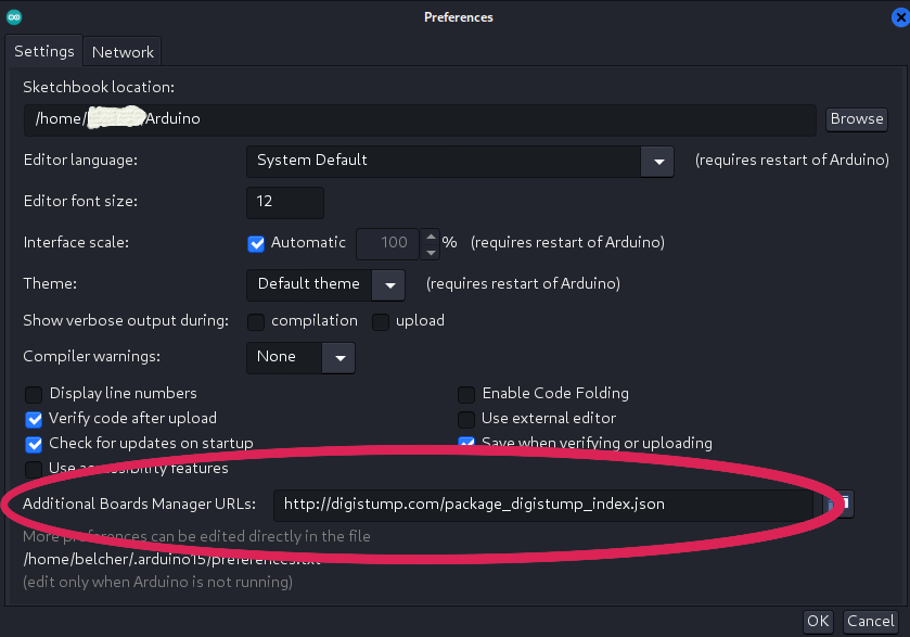 Nachdem wir die Arduino IDE installiert haben müssen wir noch die Konfigurationsdatei für den Digispark hinzufügen. Klicken wir also auf File und dann auf Preferences. Im neuen Fenster müssen wir nun folgende URL unter Additional Boards Manager Urls eingeben: