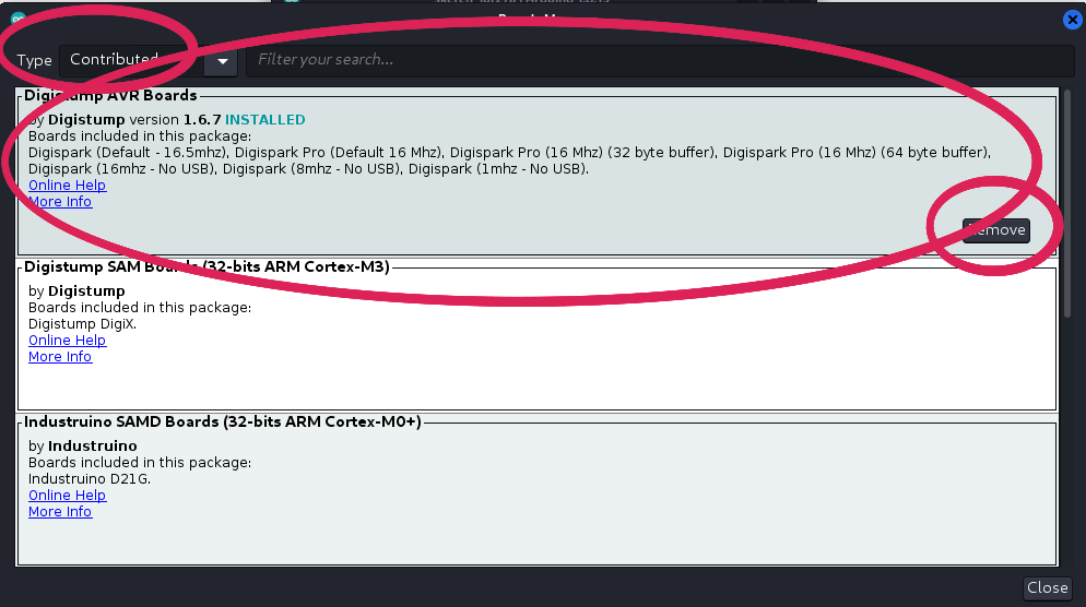 Im Dropdown wählen wir Contributed und dann klicken wir bei Digistump AVR Boards unten rechts auf Install (auf dem Bild unten steht an der Stelle Remove, da ich das Paket bereits installiert habe).