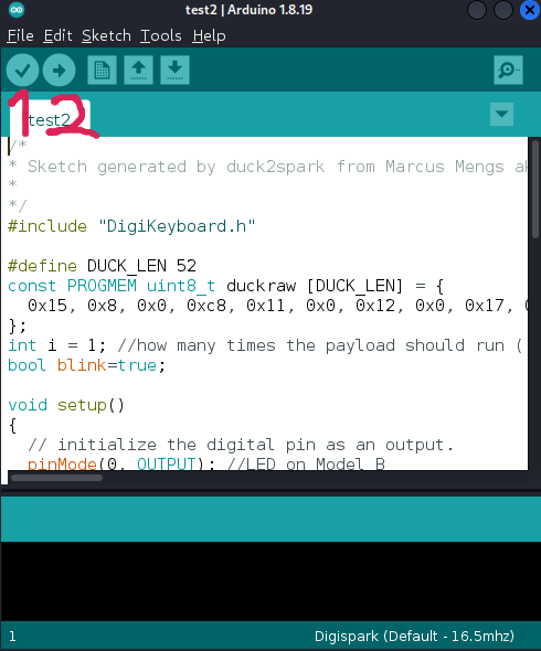 Jetzt klicken wir auf den Haken (1), um den Code zu verifizieren, im Anschluß klicken wir auf den Pfeil (2) und schreiben so den Code auf den Digispark.