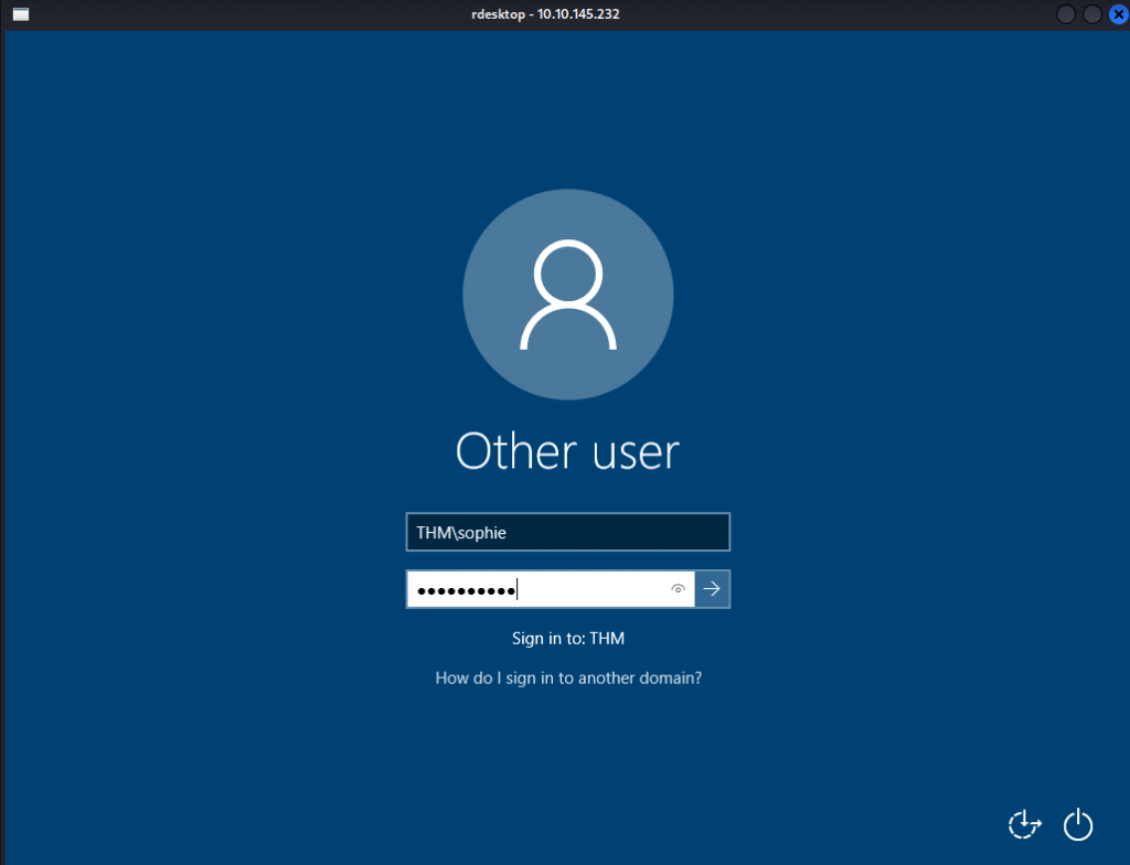 rdesktop -u THM\sophie 10.10.145.232 -v