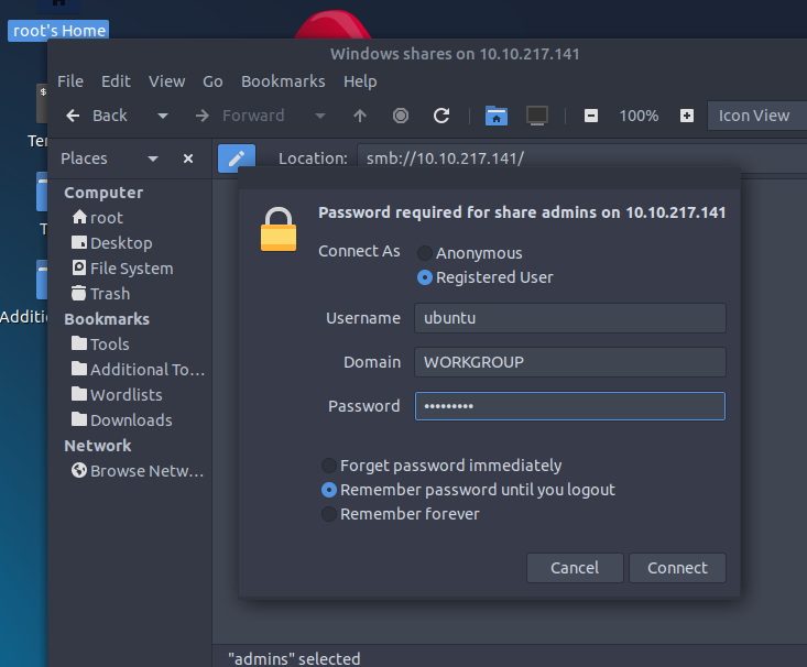 Wie im Text angegeben loggen wir uns via smb auf dem Server ein. Hierzu öffnen wir die Ordnerstruktur und geben nach „Location“ die Adresse an. Danach klicken wir auf den „admin“-Ordner, auf „Registered User“ und geben die Logindaten (ubuntu:S@nta2022) ein: