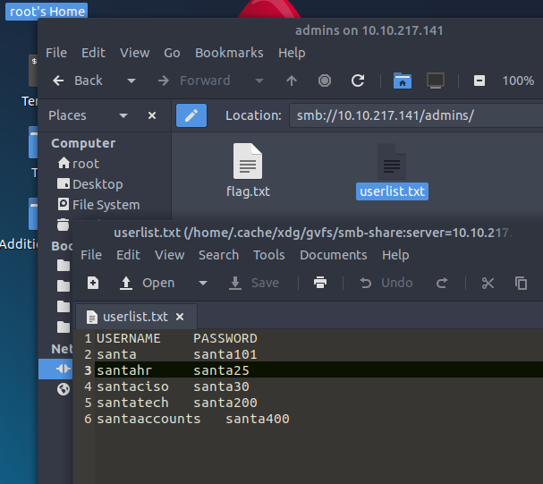 10.10.249.191 - - [18/Nov/2022:12:34:39 +0000] "GET /santaslist.txt HTTP/1.1" 200 133872 "-" "