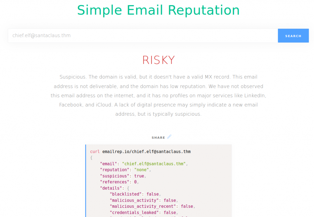 Wir gehen auf die Website und geben die Absenderadresse (chief.elf@santaclaus.thm)in die Suchleiste ein: