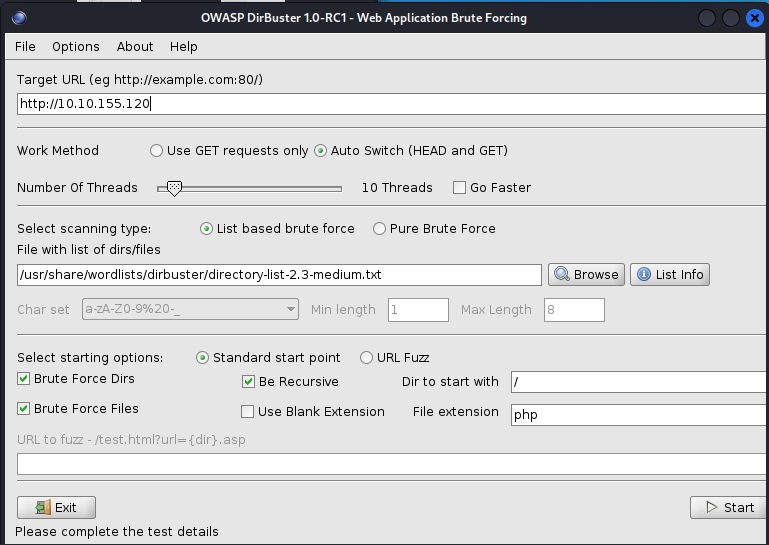 dirbuster -l /usr/share/wordlists/dirbuster/directory-list-2.3-medium.txt -u http://DIE_IP_DEINER_MACHINE