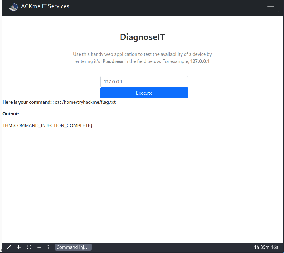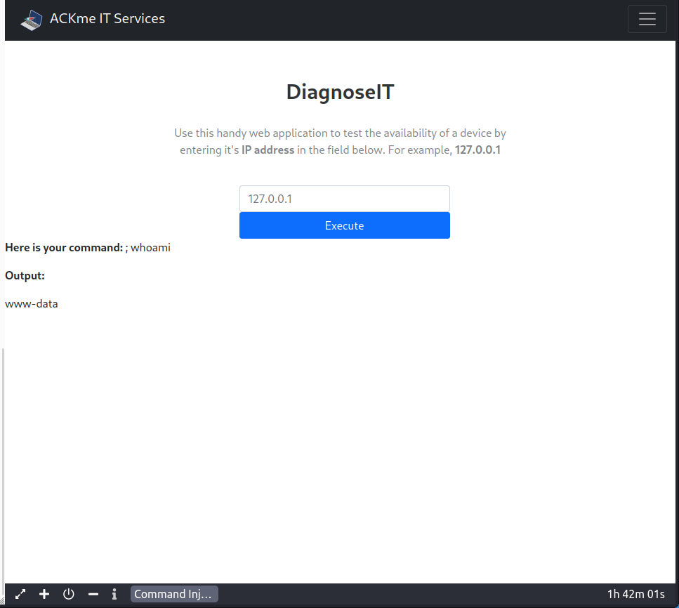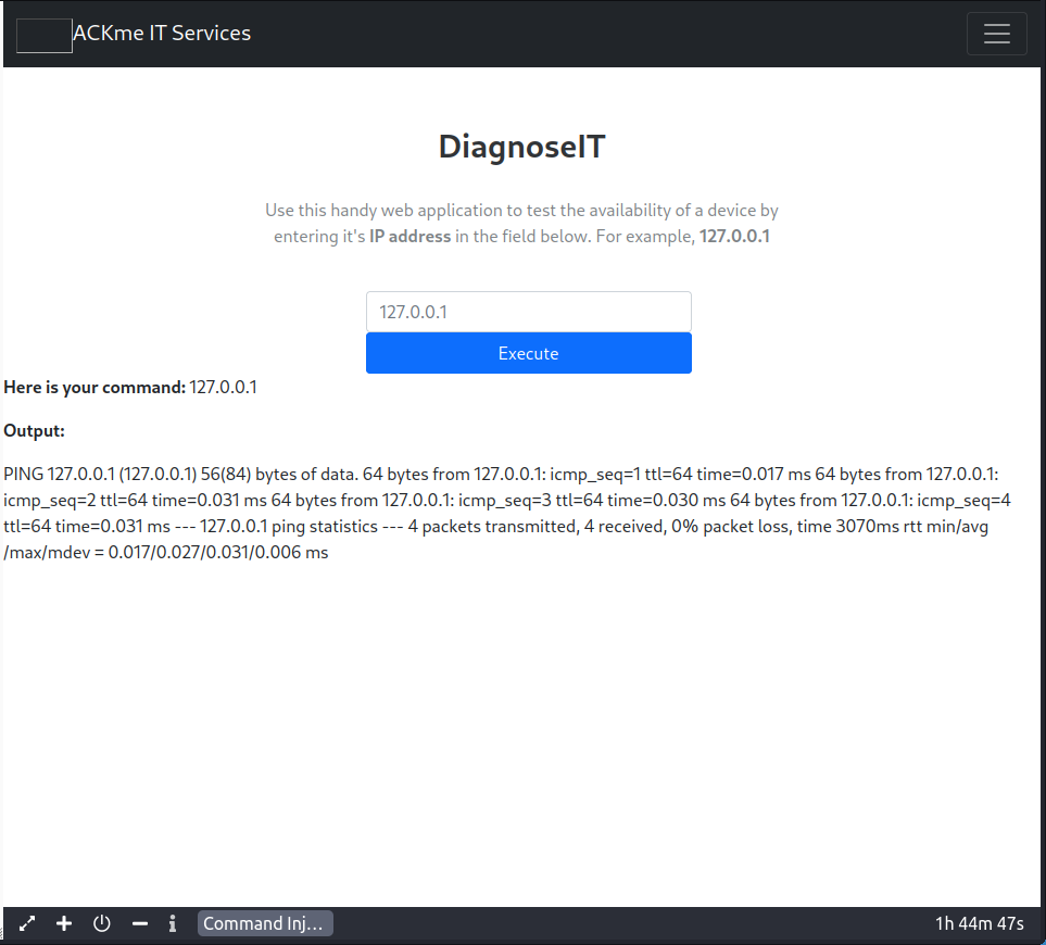 Hier sehen wir, dass der „versteckte“ Befehl für den Output wahrscheinlich „PING 127.0.0.1“ ist und ganz normal über die Kommandozeile ausgeführt wird. Wir müssen also den PING Befehl unterbrechen und einen neuen Befehl einfügen. Das erreichen wir mit einem Semicolon „;“.