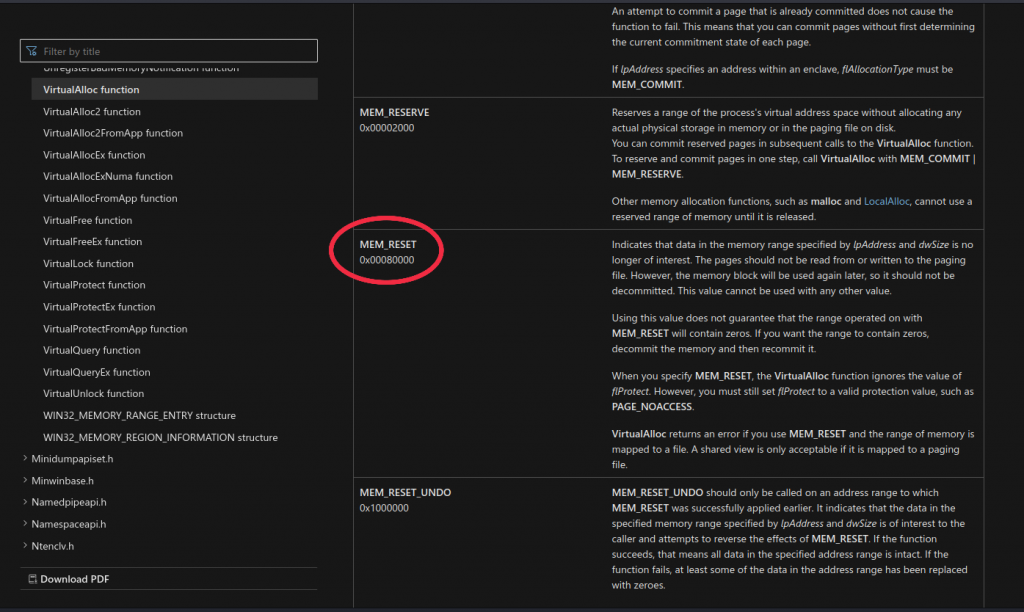 Wir öffnen die Seite der API Dokumentation und geben im Suchfeld „0x00080000“ ein. Unter den Ergebnissen suchen wir nun das mit „VirtualAlloc function“ und öffnen die Seite. Auf dieser Scrollen wir herunter, bis wir unseren gesuchten Wert gefunden haben.