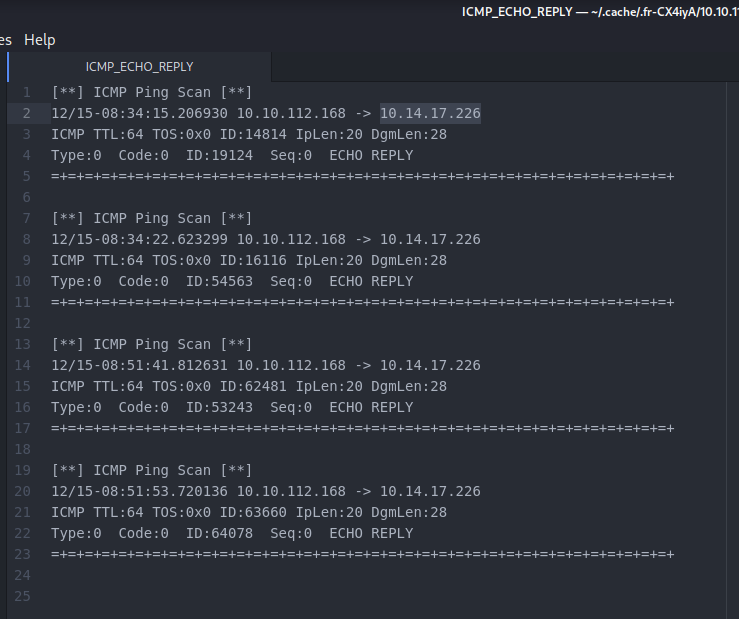 Zuerst müssen wir die bereitgestellten Dateien herunterladen, es ist ein Archiv mit dem Namen „1010112168.tar.gz“. Wir entpacken es und öffnen die Datei „ICMP_ECHO_REPLY“ mit einem Texteditor. Dort finden wir die gesuchte IP Adresse, die unser System pingt.
