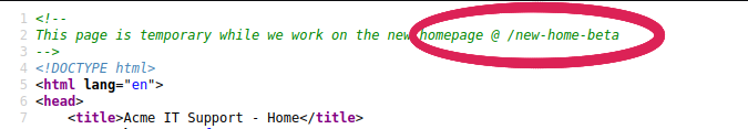 Von der Startseite (https://MACHINE_IP.p.thmlabs.com/) lassen wir uns dem Quellcode anzeigen. Im ersten Kommentar, ganz oben, sehen wir einen „halben“ Link. Diese Seite müssen wir aufrufen: