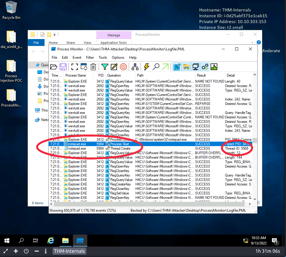 Wir haben noch „notepad.exe“ in der Tree-Ansicht ausgewählt und drücken auf „Go to process“ im selben Fenster, danach schließen wir das Fenster. Im regulären Programm haben wir jetzt die „notepad.exe“ ausgewählt. Hier doppelklicken wir darauf und es öffnet sich ein neues Fenster. Im neuen Fenster wählen wir den Reiter „Process“ und finden unsere Anwort.