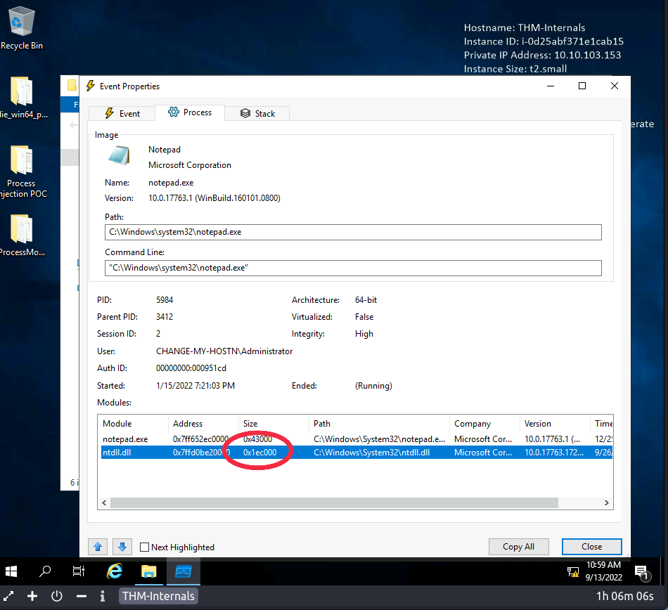 What is the size of „ntdll.dll“ loaded from „notepad.exe“?