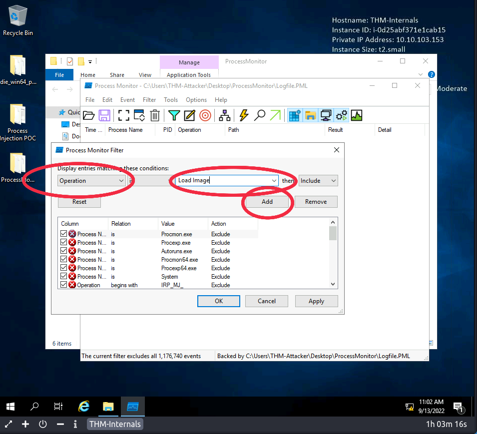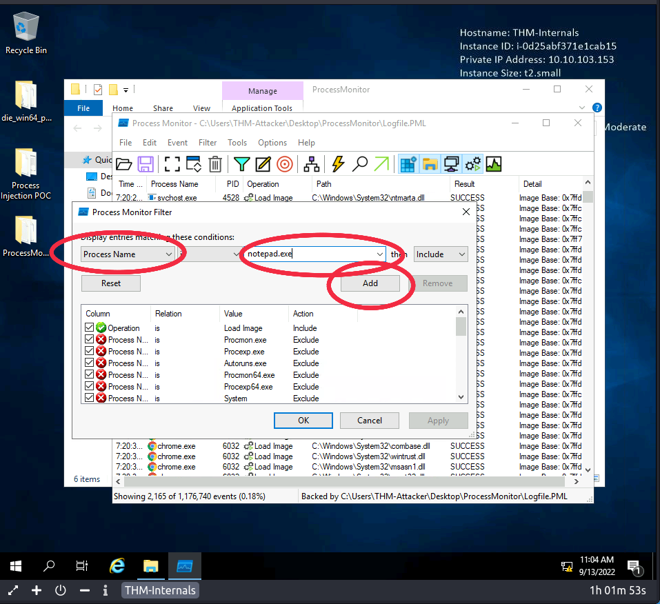 Die Zweite Filteroption ist „Process Name“ und im Textfeld „notepad.exe“. Auch hier drücken wir wieder auf „Add“ und ggf. auf „Yes“.