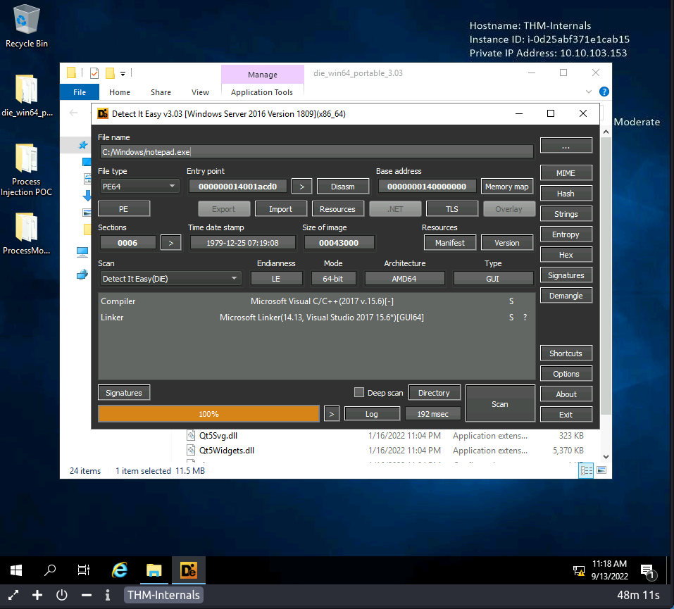 Hier öffnen wir den Desktop-Ordner „die_win64_portable_3.03“ und starten das Programm „die“. Bei „File Name“ geben wir folgenden Pfad ein“C:/Windows/notepad.exe“, alternativ kann man auch auf die drei Punkte klicken und zu „notepad.exe“ navigieren.