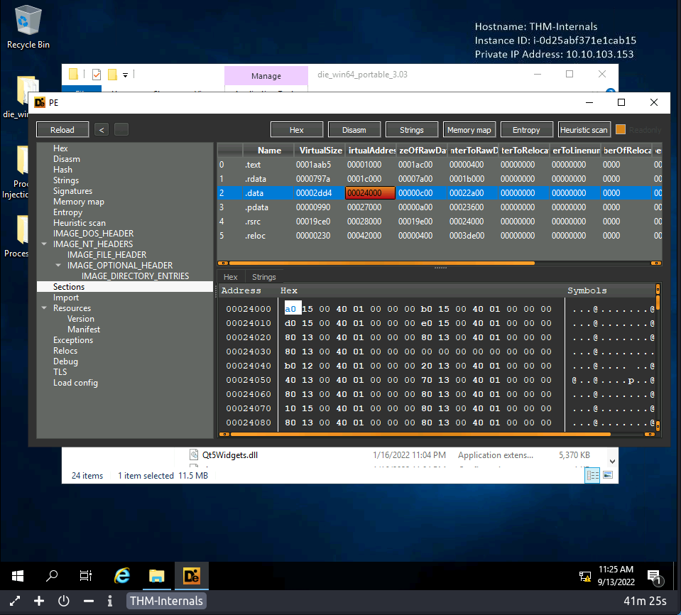 Dafür müssen wir auf den „PE“ Knopf drücken. Daraufhin öffnet sich ein neues Fenster und im linken Menü navigieren wir zu „Strings“. Rechts sehen wir dann verschiedene Werte, inklusive unseren gesuchten“virtual address“ Wert von .data.